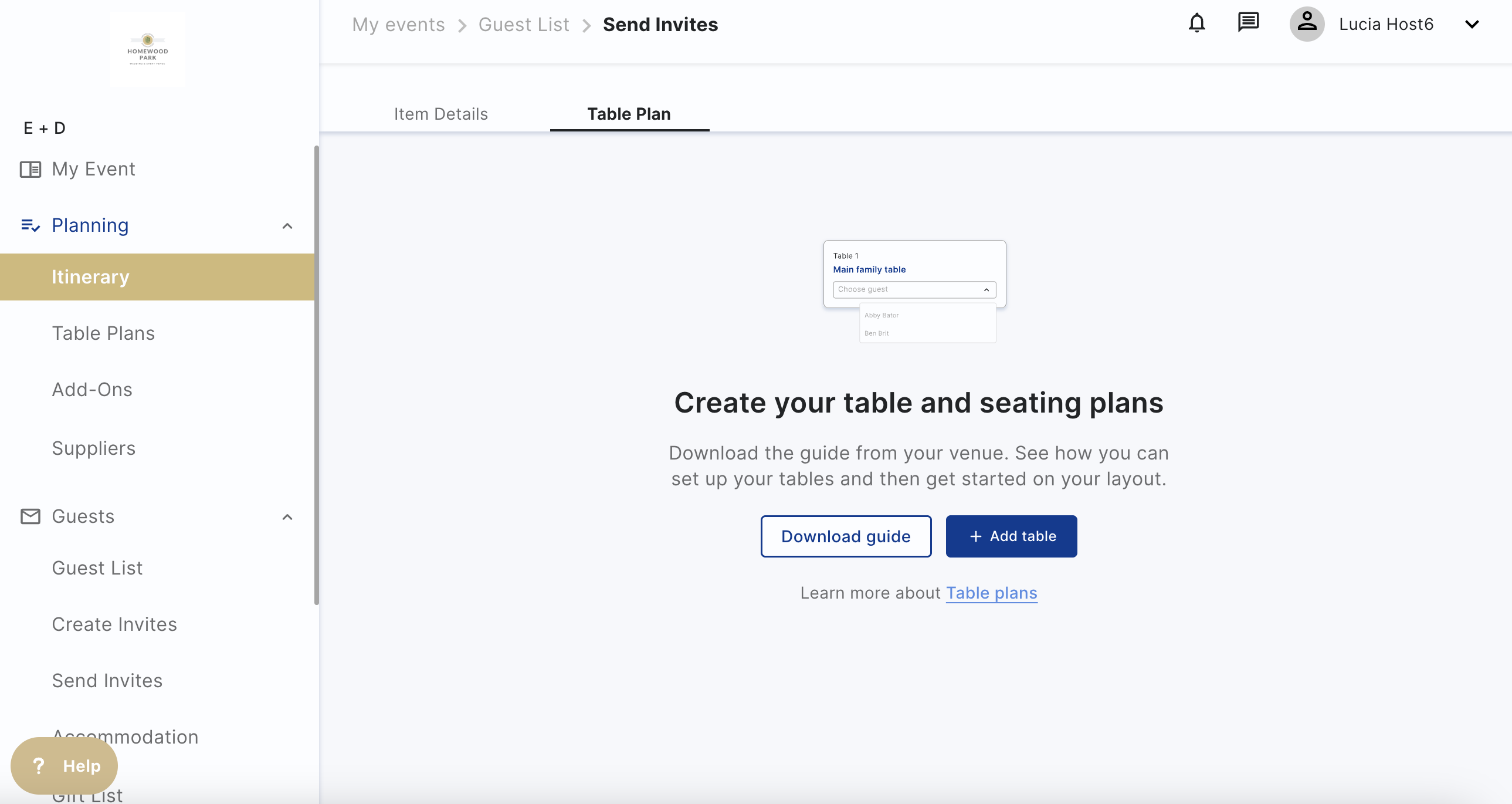 Create table plans on Hostology to easily share with your venue and the catering team. Table plans are available to create for any itinerary item that has food attached.