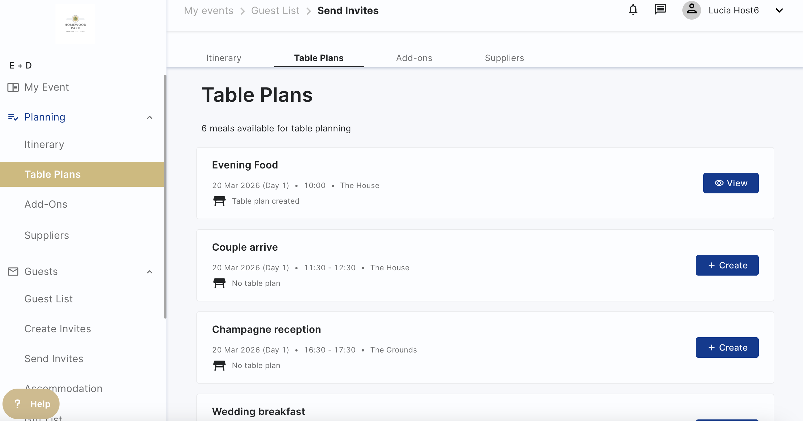 NB. If you cannot see any itinerary items for your event and want to create table plans, contact your venue and ask them to add them in!